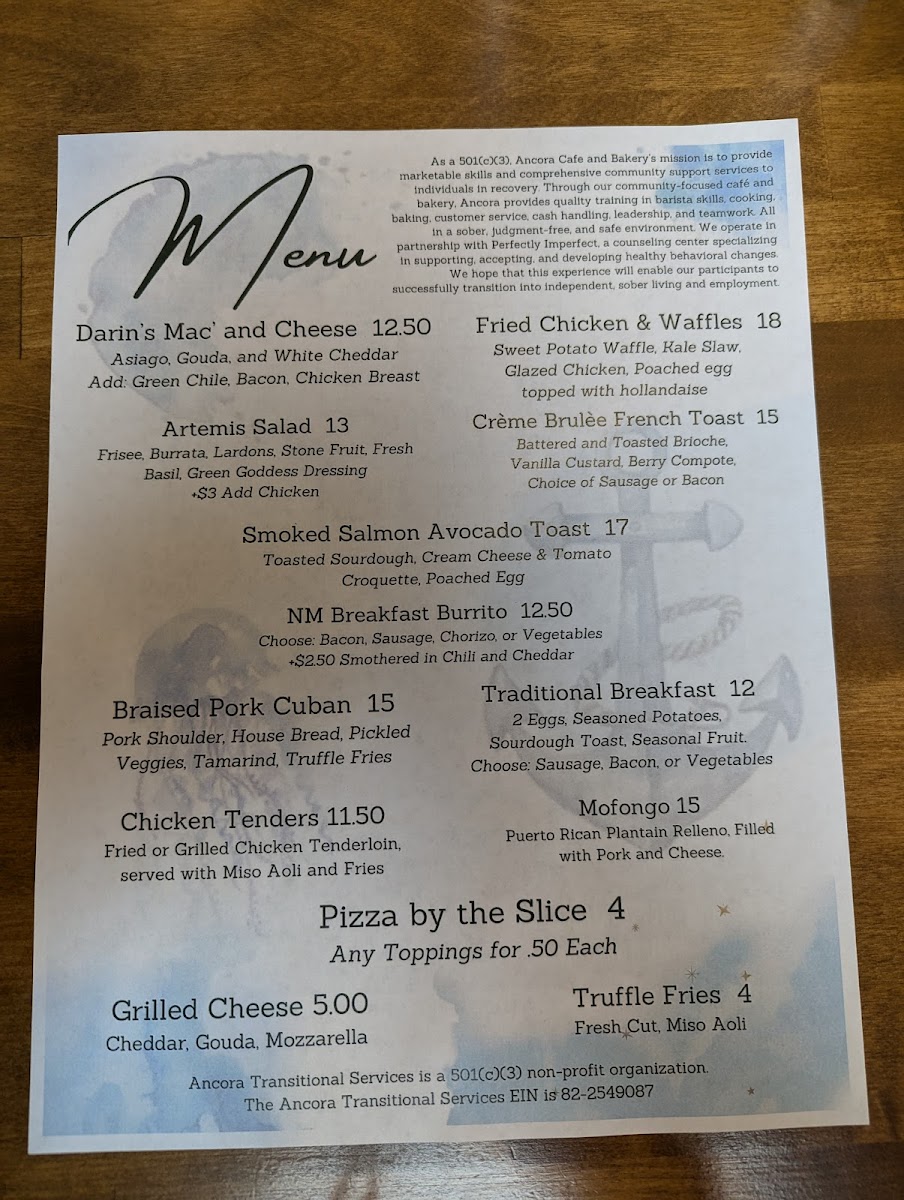 Welcome to Ancora Cafe and Bakery, a hidden gem located at 148 Quincy St NE, Albuquerque, NM. This delightful cafe is more than just a place to eat; it embodies a sense of community and purpose. The menu is a tantalizing blend of savory and sweet, featuring delights like the flavorful NM Breakfast Burrito, loaded with your choice of protein and heavenly chile sauces, sure to start your day off right. For lunch, try the Smoked Salmon Avocado Toast, adorned with a deep-fried tomato, as one enthusiastic diner noted. Pair your meal with delectable baked goods, from cookies to tiramisu, each crafted with care.